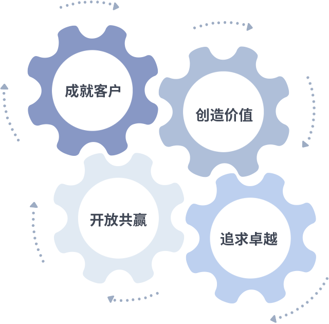 成就客户是一切决策的出发点,,,,创造价值是衡量所有工作的标准,,追求卓越是我们做事做人的态度,,开放共赢是我们的格局也是最终的结果。。价值观的齿轮环环相扣,,,推动着组织里的每个人不断向前。。。。